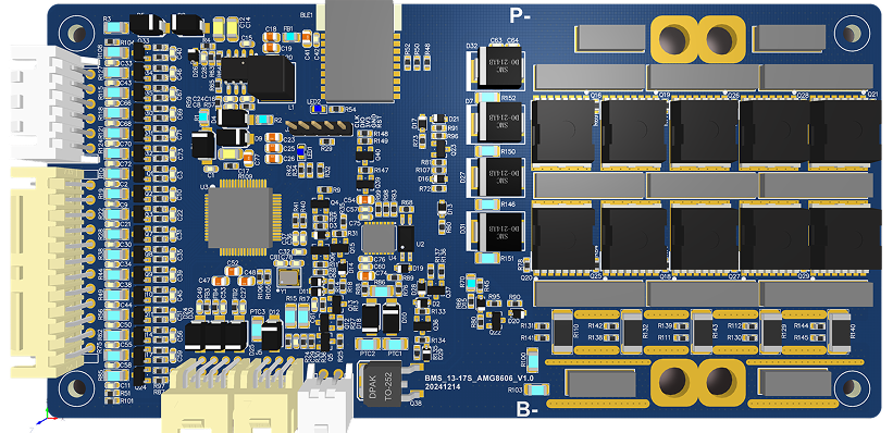 The 13-17S universal intelligent BMS protection board is designed specifically for 48-61.2V lithium batteries and is suitable for ternary lithium, lithium manganese oxide, and lithium iron phosphate batteries. Adopting a universal low edge (negative control) driving scheme, using MCU and AFE two in one chips, providing ultimate cost-effectiveness while offering multiple safety protections, effectively enhancing the safety of lithium battery products. Supports RS485 and UART communication to meet users' regular communication application needs. Optional Bluetooth module, allowing users to view and set various battery information and parameters through a mobile mini program.