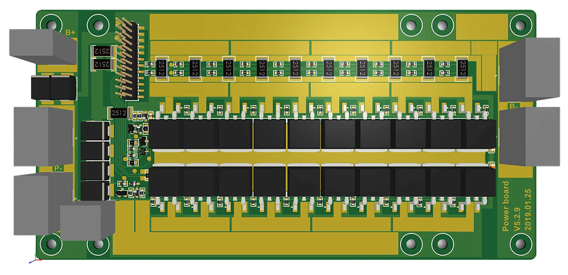 The 16-20S universal intelligent BMS protection board is designed specifically for 60-72V lithium batteries and is suitable for ternary lithium, lithium manganese oxide, lithium iron phosphate, and lithium titanate battery cells. Adopting a universal low edge (negative control) driving scheme, drawing inspiration from the automotive BMS architecture, providing multiple safety protections, effectively enhancing the safety of lithium battery products. Supports RS485 and CAN communication to meet various communication application needs of users. In addition to the conventional communication handshake mechanism, BMS and charger can also use patented technology of "single wire self-locking wire and identification control technology" for communication handshake, reducing costs while ensuring the safety and reliability of the charging process. Optional Bluetooth module, allowing users to view and set various battery information and parameters through a mobile mini program. In addition, by selecting GPS modules, multiple precise positioning based on LBS base stations, Beidou, GPS, etc. can be achieved, supporting remote power outages and real-time monitoring of voltage, charging and discharging current, battery cells, and other data.