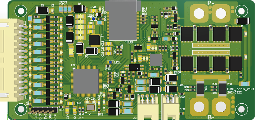 The 7-11S universal intelligent BMS protection board is designed specifically for 25-36V lithium batteries and is suitable for ternary lithium, lithium manganese oxide, and lithium iron phosphate battery cells. Adopting a universal low edge (negative control) driving scheme, using MCU and AFE two in one chips, providing ultimate cost-effectiveness while offering multiple safety protections, effectively enhancing the safety of lithium battery products. Supports RS485 and UART communication to meet users' regular communication application needs. Optional Bluetooth module, allowing users to view and set various battery information and parameters through a mobile mini program.